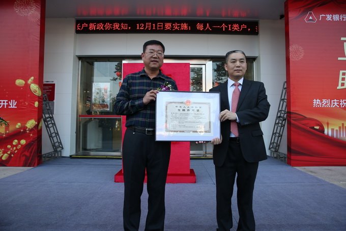 儀式上,副市長劉端雄及廣發(fā)銀行總行副行長宗樂新等共同為廣發(fā)銀行揭陽中德支行揭牌。揭陽銀監(jiān)分局局長王學臣向中德支行行長陳凱鴻授支行《金融許可證》。
