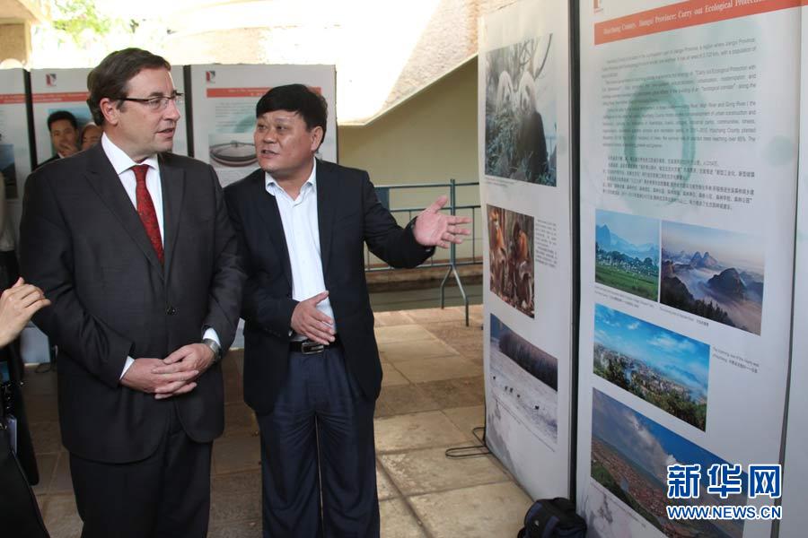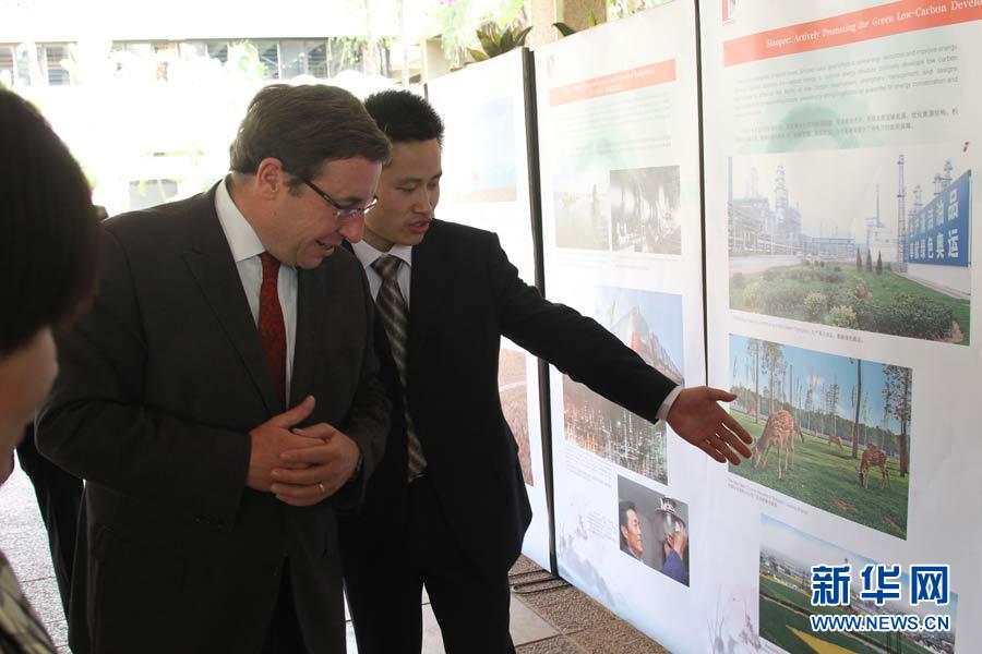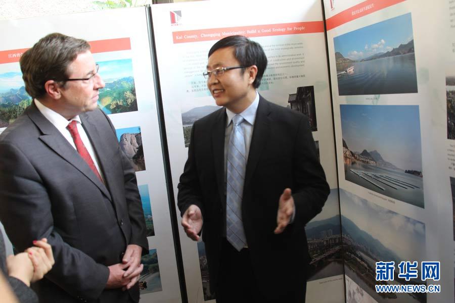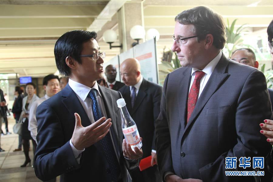 廣東省揭陽市副市長陳澄民(左)向聯(lián)合國副秘書長施泰納介紹揭陽市環(huán)保圖片。5月20日,“明月行動.綠色中國夢”大型環(huán)保公益活動中國環(huán)保圖片展在肯尼亞首都內(nèi)羅畢聯(lián)合國環(huán)境規(guī)劃署新華影廊舉行,展示中國地方政府和大型國資企業(yè)與知名企業(yè)關(guān)注環(huán)保、力行環(huán)保、堅持環(huán)保的上百張圖片,廣東省揭陽市政府、中國石化集團(tuán)、西安浐灞生態(tài)區(qū)和加多寶集團(tuán)昆侖山礦泉水公司等代表在展覽中向聯(lián)合國官員及來賓介紹生態(tài)環(huán)保成就。汪勇基攝