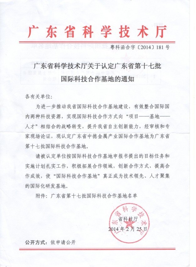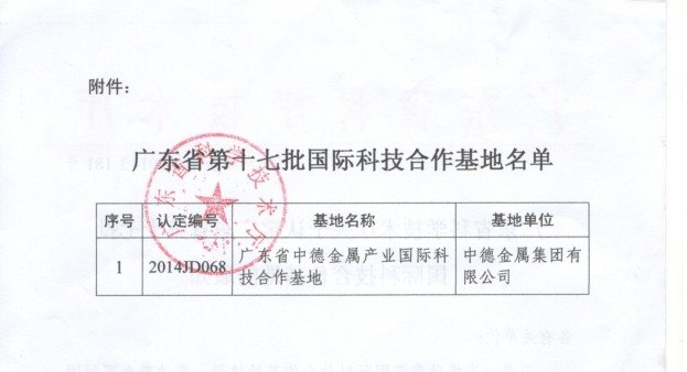 近日,中德金屬產(chǎn)業(yè)國際合作基地被廣東省科學(xué)技術(shù)廳認(rèn)定為廣東省第十七批國際科技合作基地,標(biāo)志著中德金屬集團(tuán)有限公司在整合國內(nèi)外科技資源、引進(jìn)專業(yè)技術(shù)人才、提升自主創(chuàng)新能力等方面獲得省級(jí)認(rèn)可及重點(diǎn)支持,這將進(jìn)一步加快基地高新企業(yè)集聚,助推中德合作、綠色發(fā)展更上新臺(tái)階。