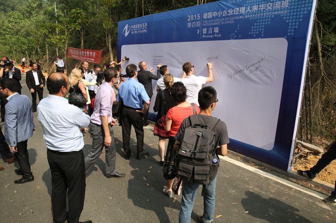 通過(guò)實(shí)地考察和聽(tīng)取情況介紹,德國(guó)中小企業(yè)經(jīng)理人對(duì)中德金屬生態(tài)城表現(xiàn)出濃厚興趣。在開(kāi)班儀式后,他們來(lái)到了中德金屬生態(tài)城萬(wàn)畝森林公園植下中德友誼之樹(shù),并在留言墻上寫下寄語(yǔ)。MAE中德咨詢公司執(zhí)行董事馬恩工工整整地寫下“中德合作共贏”六個(gè)漢字,而CNGE國(guó)際咨詢責(zé)任有限公司首席執(zhí)行官托馬斯。諾爾廷則用“非常好”的拼音表達(dá)了他對(duì)中德金屬生態(tài)城的印象!拔覀儠(huì)再見(jiàn)的,揭陽(yáng)!”留言墻上記錄了德國(guó)中小企業(yè)經(jīng)理人的熱切期待和美好愿景。