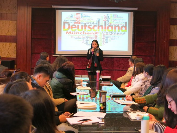 主講導(dǎo)師丁逢從德國(guó)國(guó)旗、地理位置、英語(yǔ)與德語(yǔ)的差異等方面為學(xué)員做了導(dǎo)入性的介紹,并提供了德語(yǔ)學(xué)習(xí)建議及應(yīng)用APP。她還現(xiàn)場(chǎng)教授了德國(guó)人的日常問候語(yǔ)與自我介紹基本用語(yǔ),讓學(xué)員得以更快地學(xué)以致用。